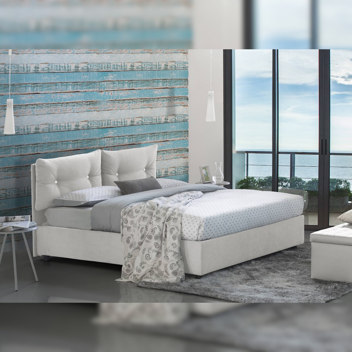Dmora Dabbadi Queen-Size-Bett, Bettkasten mit Stoffbezug, 100 % Made in Italy, Öffnung vorne, inklusive Matratze 120 x 190 cm, Weiß