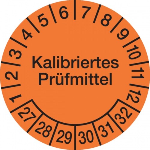 König Werbeanlagen Prüfplakette ab 27, Kalibriertes Prüfmittel, Orange/Schwarz, Folie, Ø 30´mm - Bogen = 10 Plaketten - 30 mm Folie selbstklebend