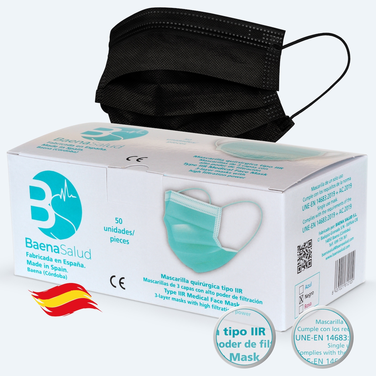 Baena Salud 50 Einweg-Schutzmasken chirurgisch, Typ IIR, in schwarzer Farbe, Filtration (BFE) 98%, hergestellt in Spanien