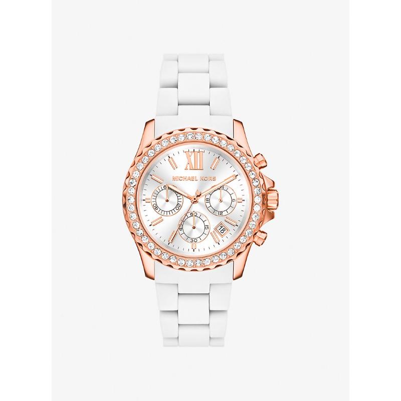 Michael Kors Oversized Everest Pavé Rose Gold-Tone and Silicone Watch MKO1133 white