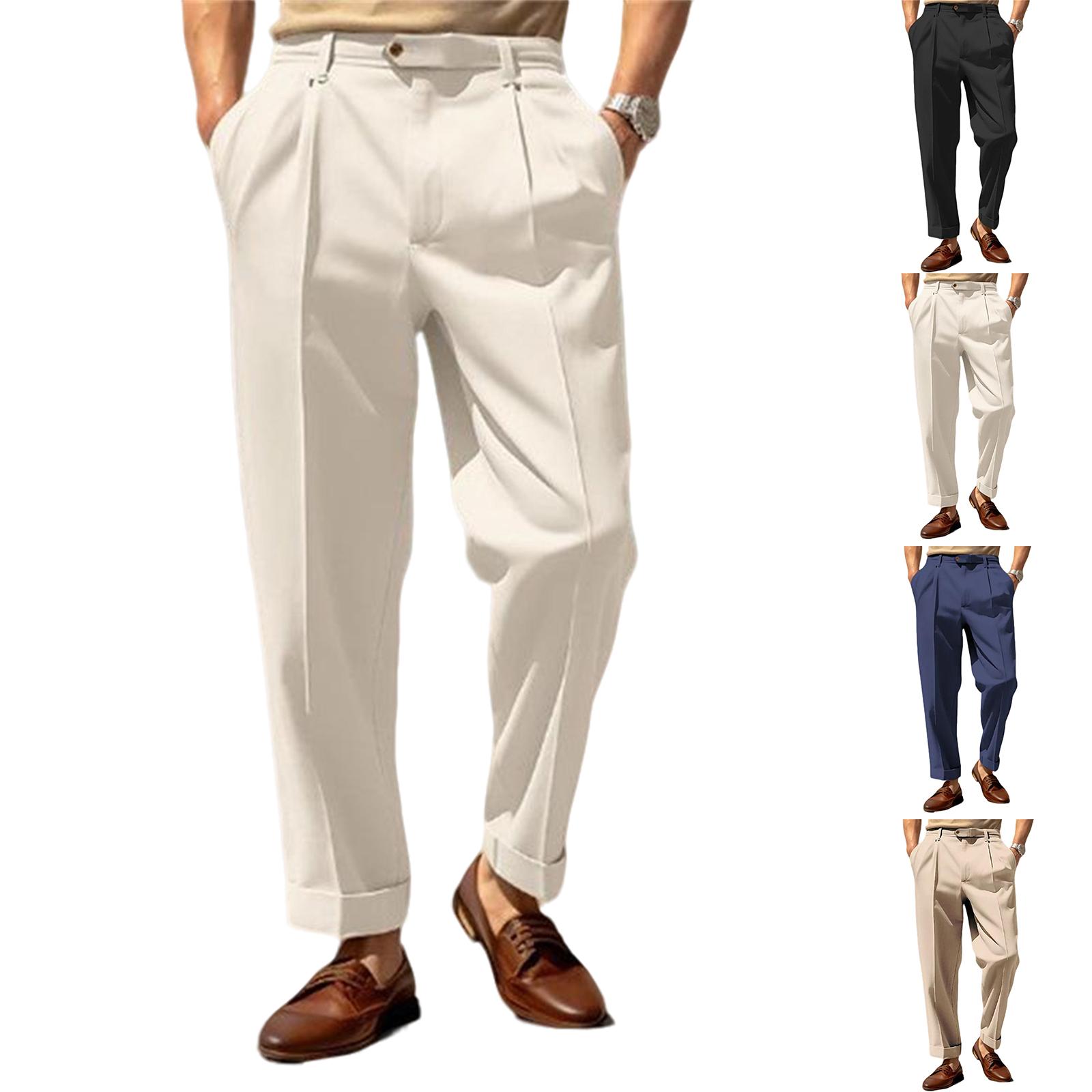 Men's Button Tapered Suit Pants Classic-Fit Pleated Dress Pant Lightweight Straight-Legs Men Trousers cm white