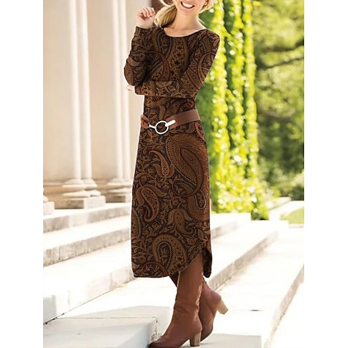 Per donna Abito Midi Tubino Abito a Tubino Casual Quotidiano Vestibilità regolare Grafico Paisley Astratto Manica Lunga Girocollo Marrone Primavera Autunno Inverno