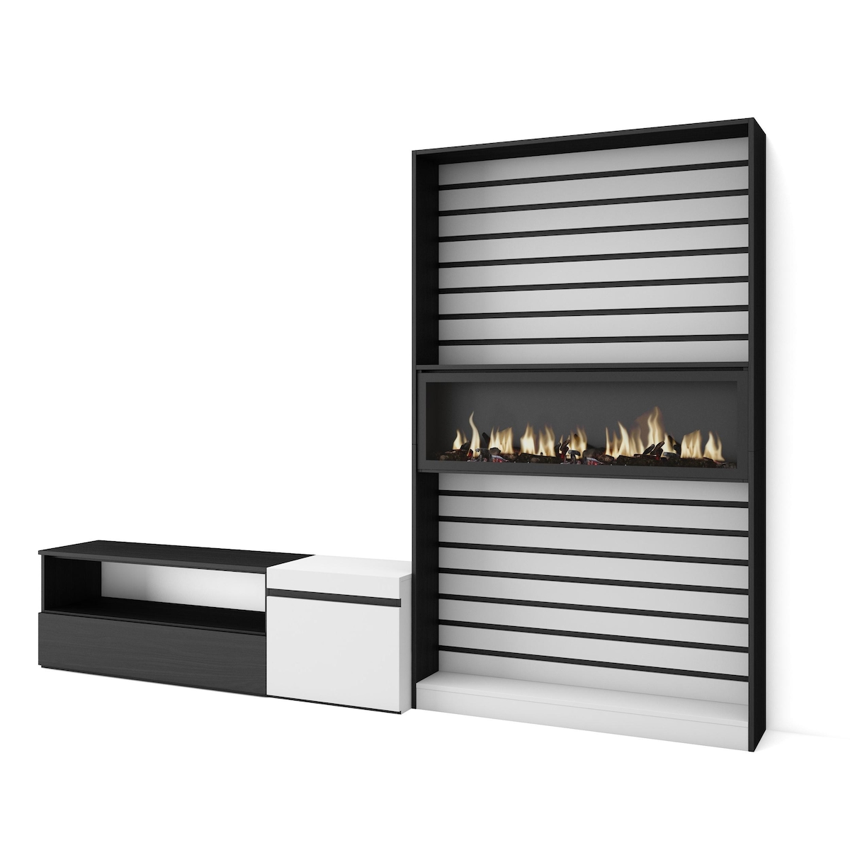 SKRAUT HOME Wohnzimmer-TV-Schrank, Wohnzimmer-Wandsystem, 360x35x186cm, Für TVs bis 65“, Elektrischer Kamin, Moderner Stil, Schwarz und weiß _ 110_386