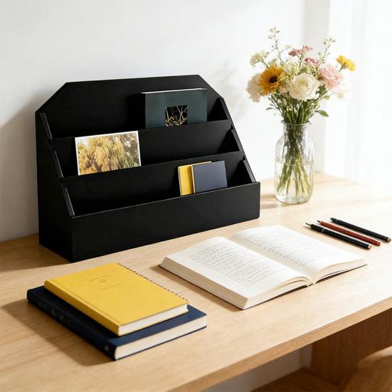 Greeting Card Display Stand Wooden 3-Tier Storage Rack with Rustic Brown Finish Large Capacity Postcards Stickers Organizer for black