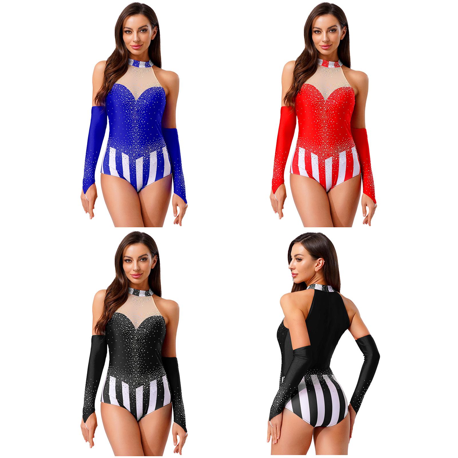 Body de Maîtresse de Cérémonie de Cirque pour Femme Pailleté Strass Bloc de Couleurs Justaucorps Sans Manches Gants Sans Doigts Vêtements de Danse Gym