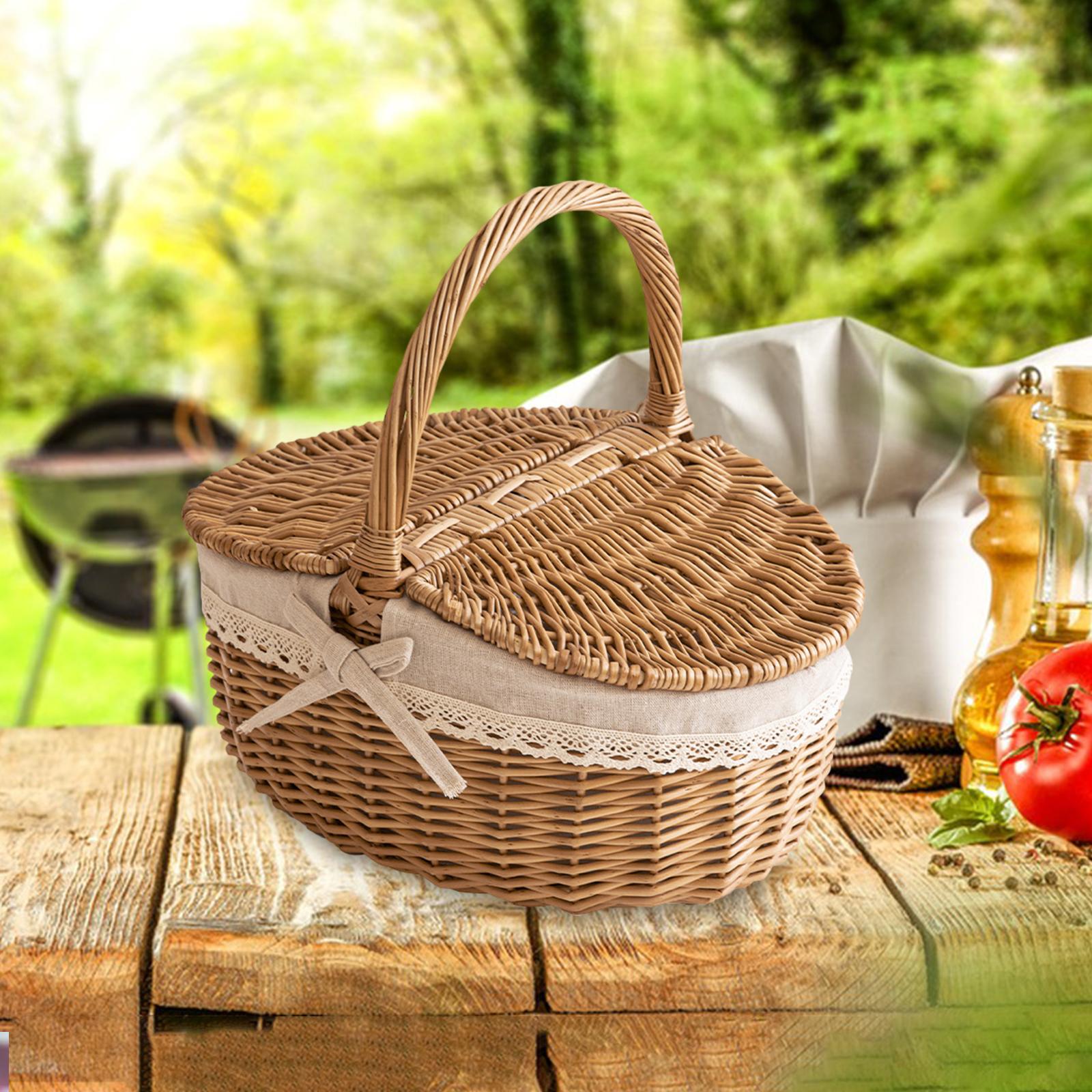 Picknickkorg i flätverk med lock och handtag, robust vävd kropp med tvättbart foder för påsk, mors dag, utomhuscamping