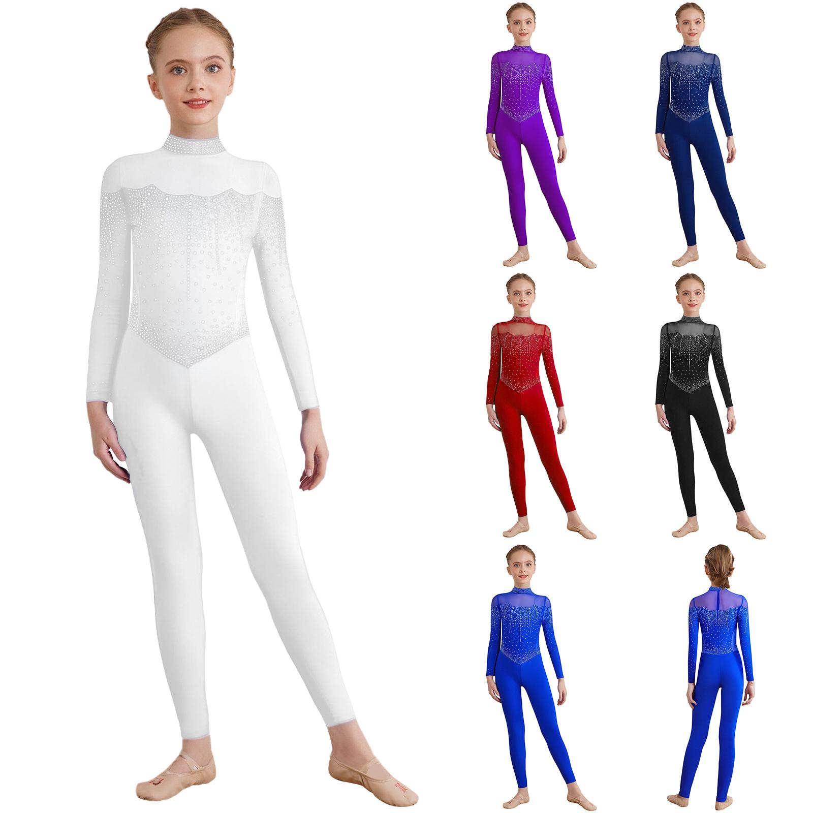 Justaucorps intégral à strass brillants pour filles, col montant, manches longues, patchwork en maille transparente, combinaison, justaucorps de patin