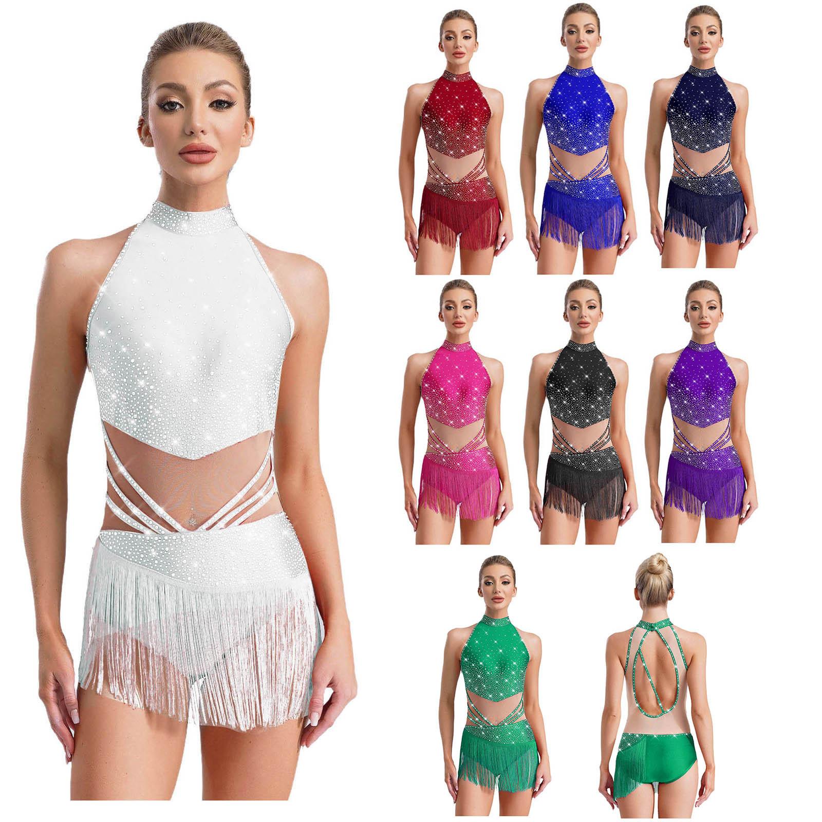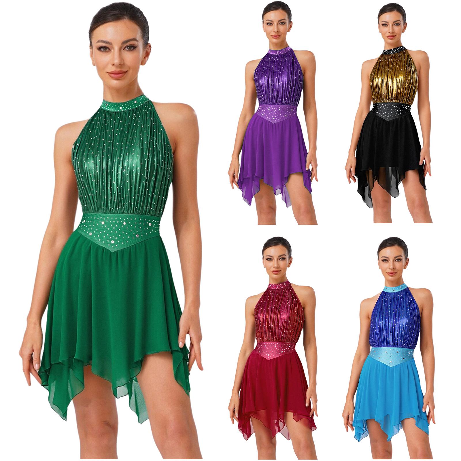 Robe de patinage artistique pour femmes, Costume de spectacle de danse lyrique, sans manches, strass, dos creux, ourlet irrégulier, robe de Ballet Leo