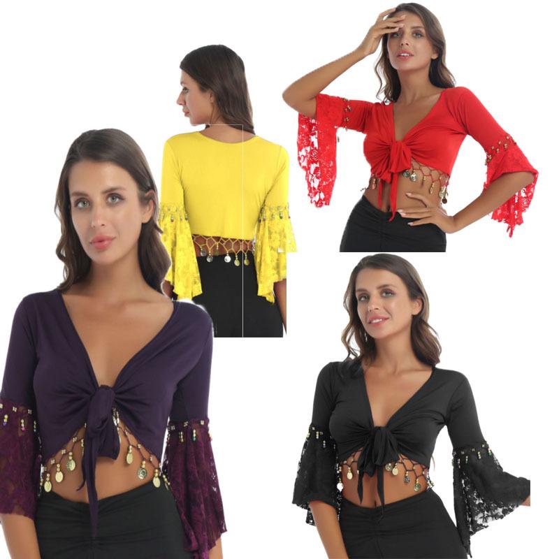 Costume de danse du ventre pour femmes, en dentelle, Patchwork, manches évasées, cloche, perles, pompon, châle, haut court, Cardigan cm bleu ciel