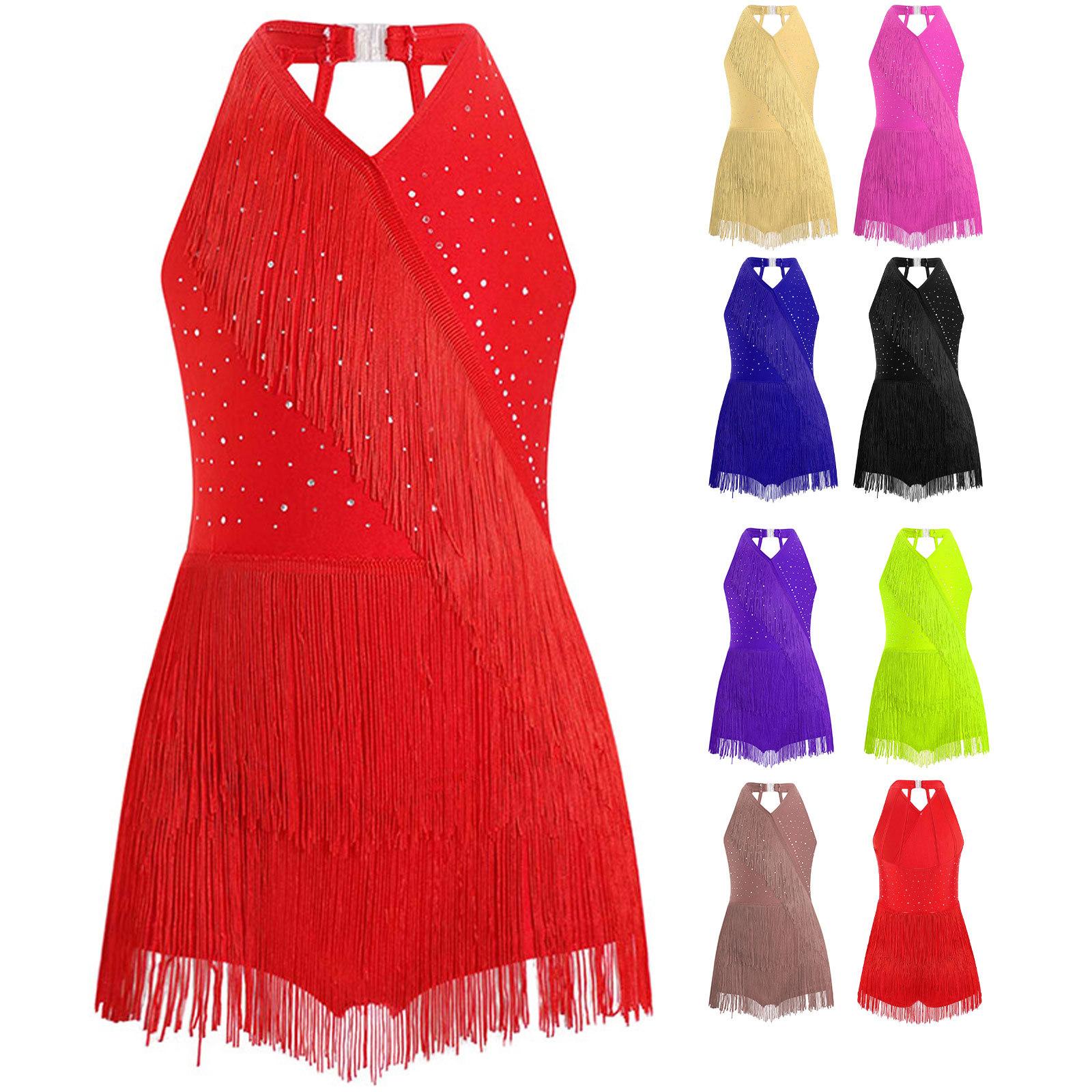 Robe de danse latine pour filles, sans manches, à franges brillantes, justaucorps à jupe à pompons, vêtements de danse de fête cm rouge