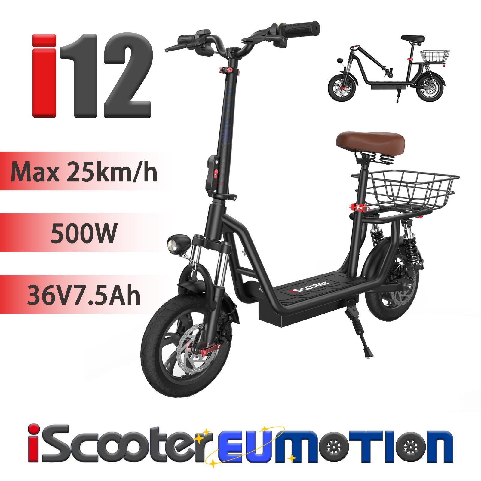 Trottinette Électrique Pliante iScooter i12 avec Grande Roue de 12 , Panier Arrière, Siège, Moteur 500W, Batterie 36V7.5Ah, Affichage LED, Freins à Di
