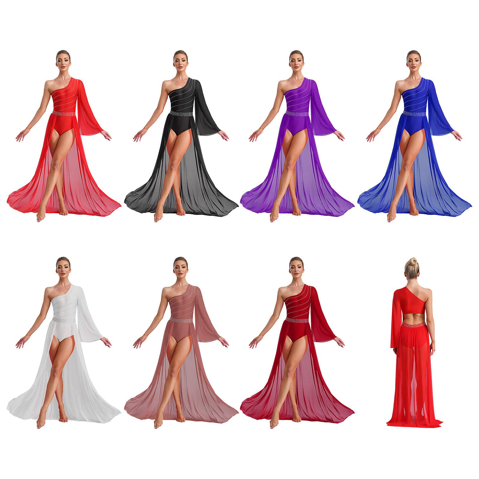 Damen Lyrisches Tanzkostüm Ein Schulter Ärmel aus transparentem Mesh Glänzende Strasssteine Kleid cm schwarz