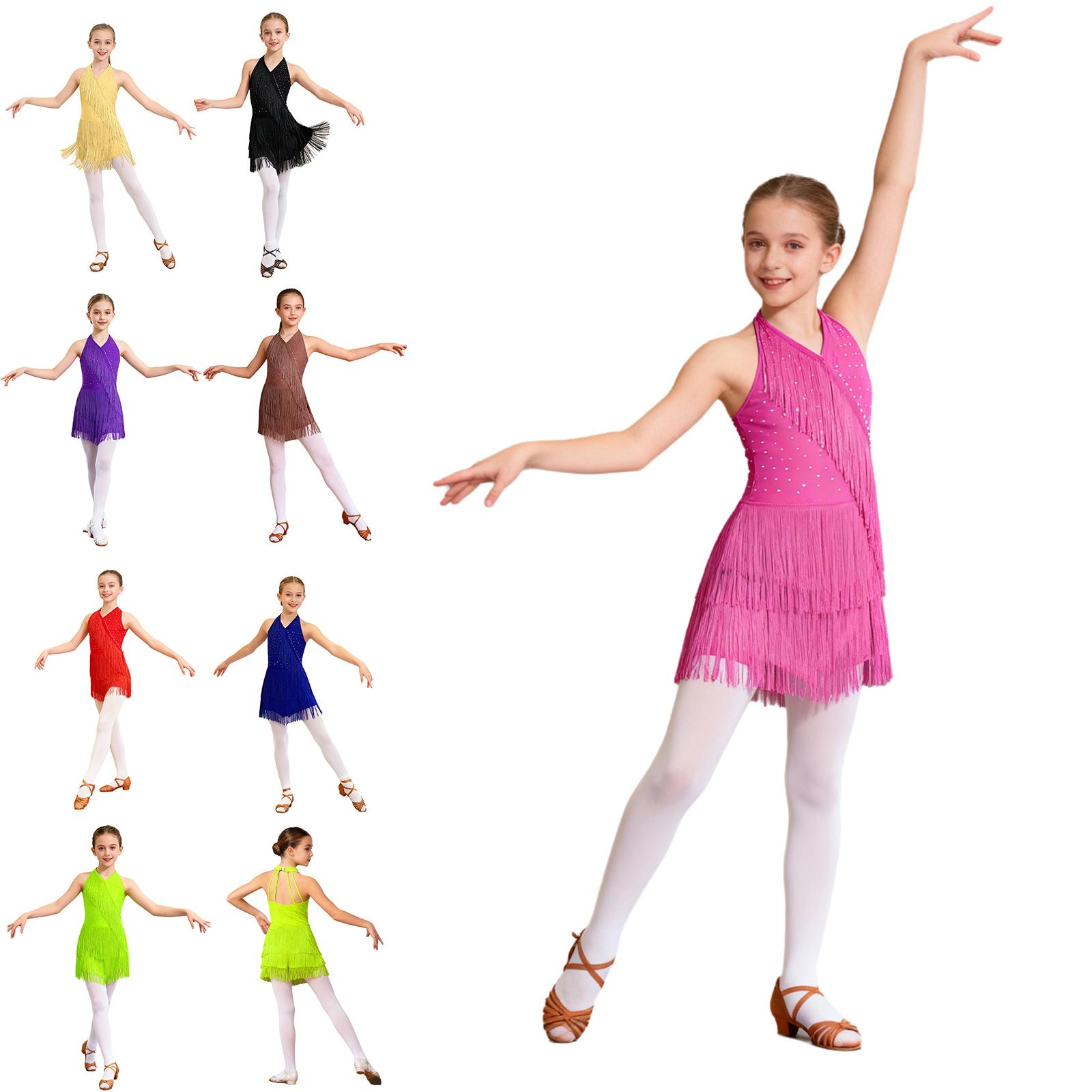 Robe de danse latine pour filles, justaucorps à franges et strass, jupe à col en V, sans manches, à franges cm