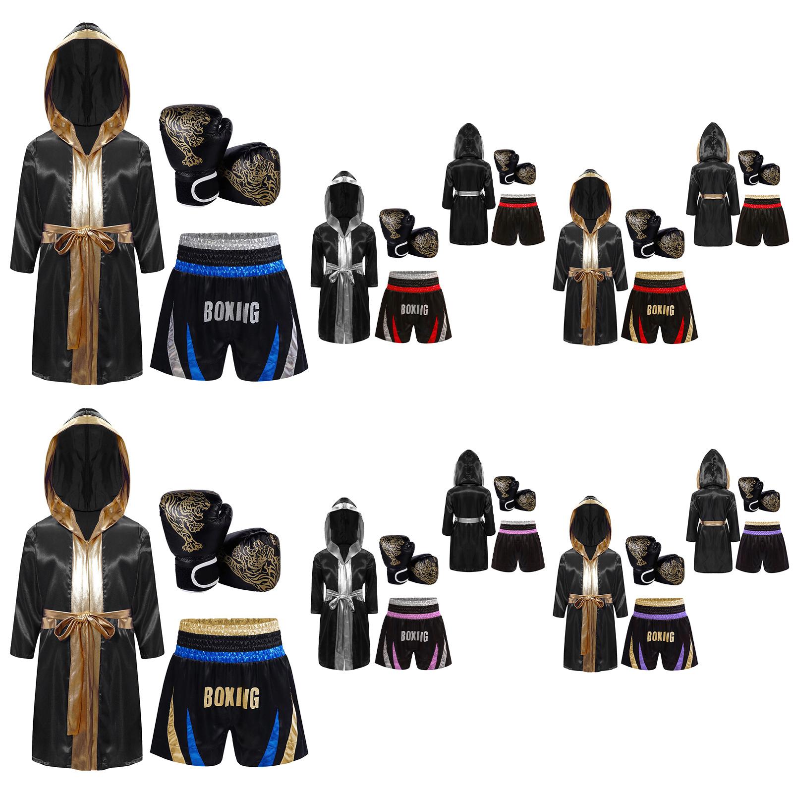 Ensemble d'équipement de boxe pour garçons: Robe en satin à ceinture avec bordure métallisée, Short color block et Gants d'entraînement imprimé tigre