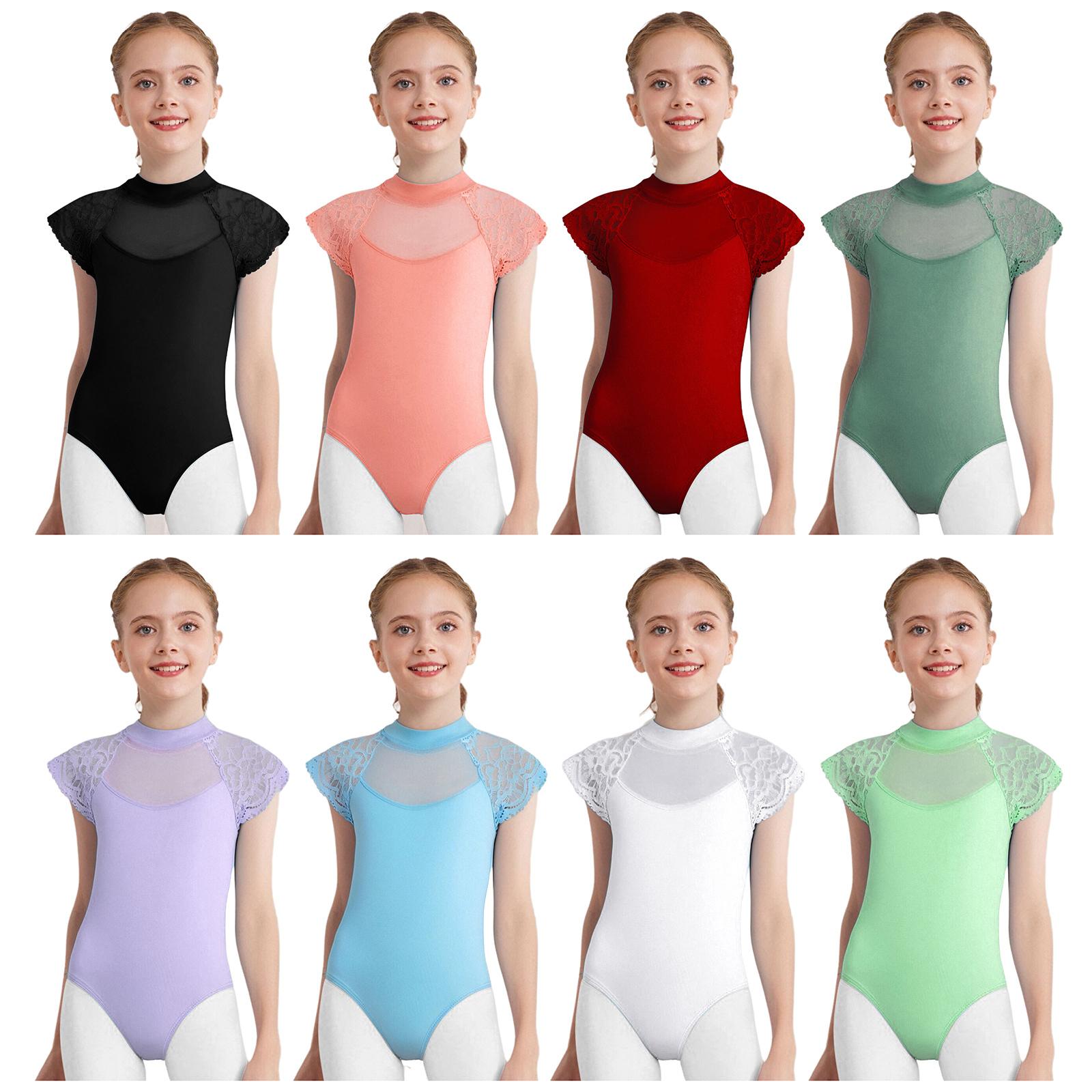 Mädchen Tanzbody Spitze Kappenärmel Transparenter Mesh-Patchwork Ausschnitt Body Ballett Prüfungsbekleidung schwarz