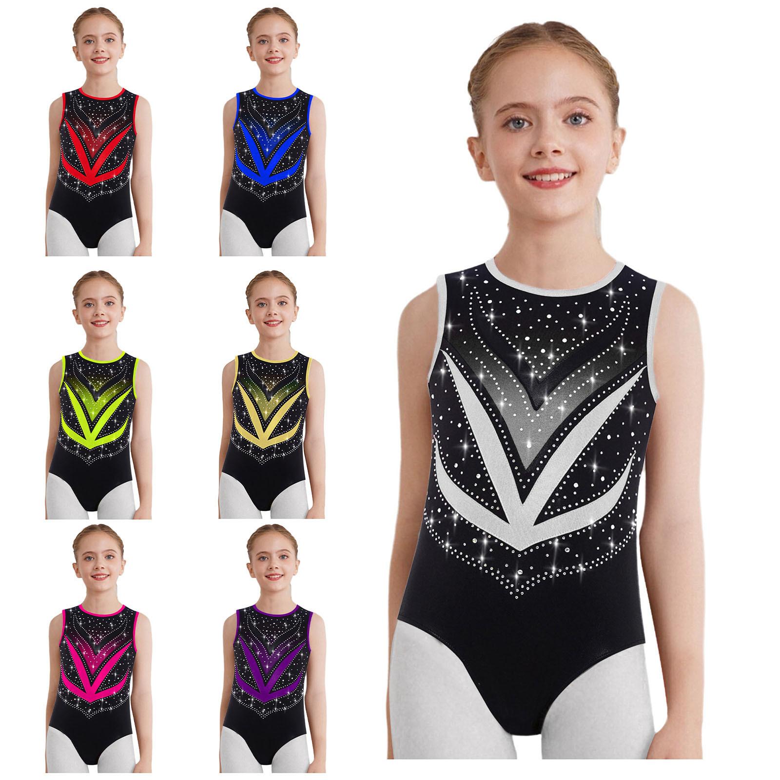Combinaison de compétition de gymnastique justaucorps sans manches pour enfants filles scintillantes