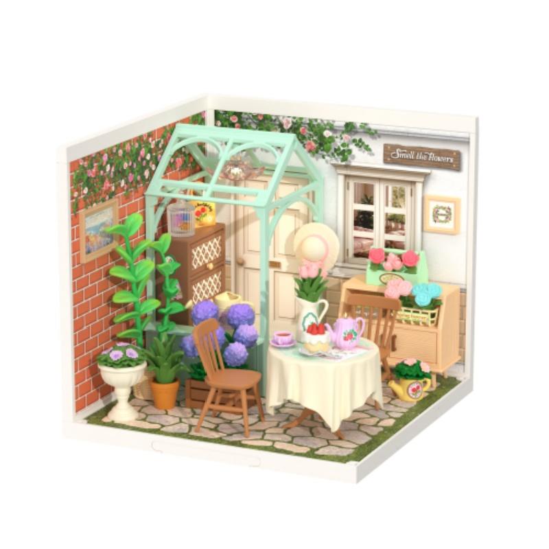 Gör-det-själv Miniatyrhus Kit 3D Trädgård Träpusselbyggnad med LED-ljusdekor Hand Miniatyr Dockhus Material Montera present till barn