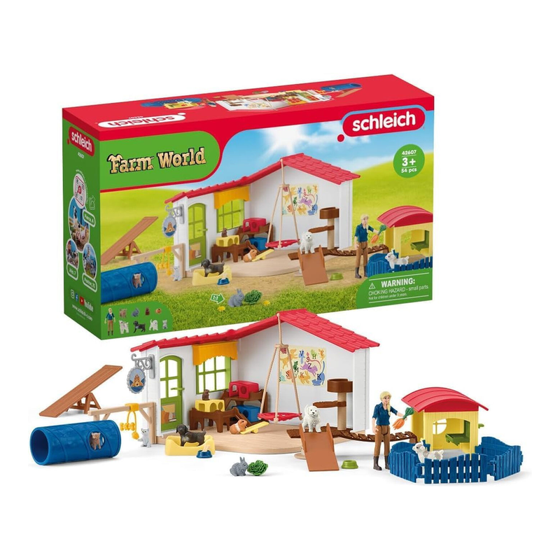 SCHLEICH Farm World | Tierhotel 42607 | Set mit Haus, Stall, Tierpfleger, Hund, Katze, Meerschweinchen & Zubehör | Tolles Geschenk für Jungen und Mädchen | Bauernhofspielzeug ab 3 Jahren | 54 Teile