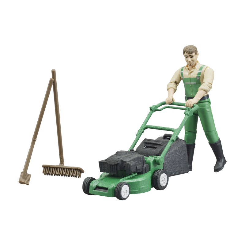 BRUDER 62103 - Bworld Gärtner mit Rasenmäher & Gartengeräten - 1:16 Mann Spielzeug-Figur Arbeiter Bauer Bauernhof Landwirtschaft Set Landwirt