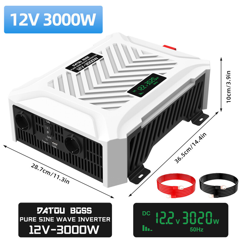 DATOUBOSS Inverter 12 V auf 230 V Spannungswandler, reiner Sinus, 3000 W / 6000 W Leistungswechselrichter mit 2 EU-Steckdosen, USB/USB-C und LCD-Display, Stromtransformator für LKWs, Camping, Haushalt