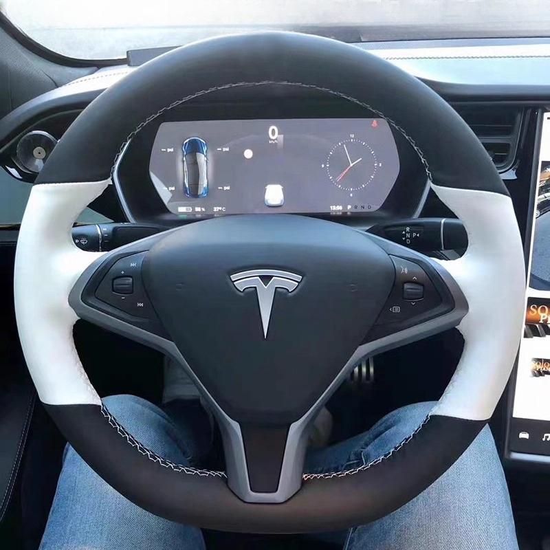För Tesla Model 3 2015- Model Y 2018- Handstickat Svart vit Läder Halkfri bil Rattöverdrag