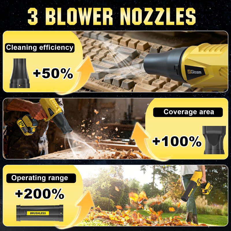 Gisam Souffleur de feuilles sans fil 21 V avec 2 batteries 4000 mAh et chargeur, 3 vitesses, 3 buses de soufflage, 170 000 tr/min