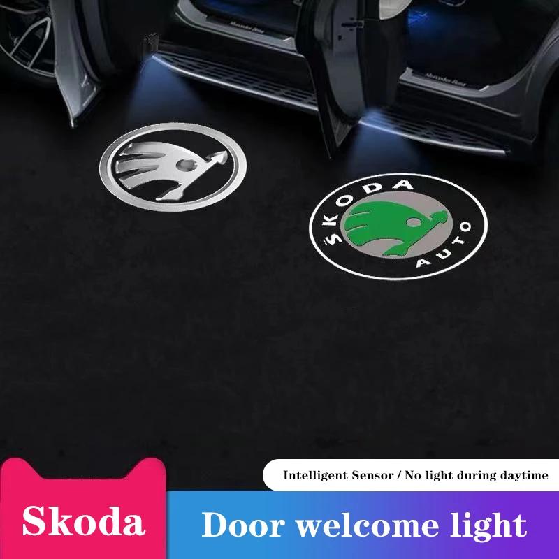 2025 Ny 2 stk Trådløs LED Bil Dør Velkomst Laser Prosjektor Logo Ghost Shadow Nattlys For Skoda Octavia Rapid Kodiaq Karoq