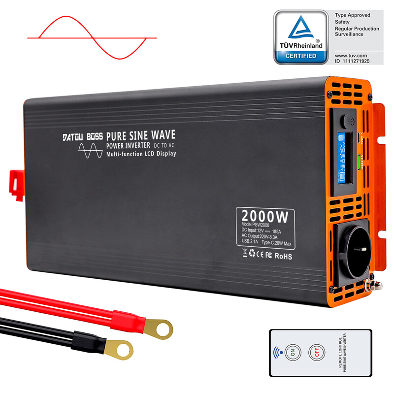 DATOUBOSS Inverter 12 V Gleichstrom auf 230 V Wechselstrom, reines Sinus-Signal, 2000 W/4000 W, Spannungswandler 12 V 230 V, LCD-Display und 1 x USB + 1 x Typ-C, Spannungswandler, reines Sinus-Signal