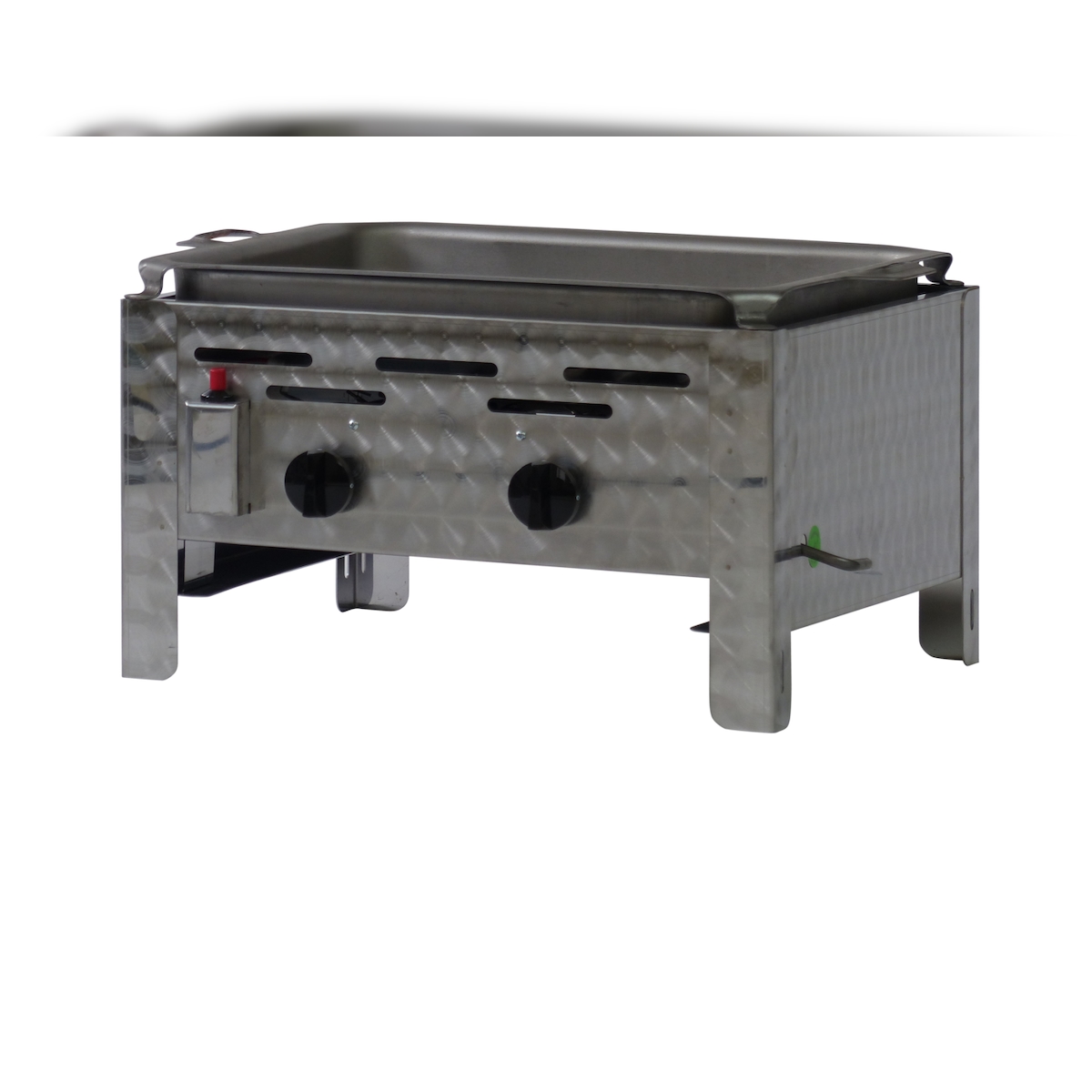 Gastrobräter, 2 Brenner je 4,5 kW, mit Edelstahlpfanne, B 480 mm x T 530 mm x H 270 mm, inkl. Gewerbedruckregler u. Schlauchbruchsicherung