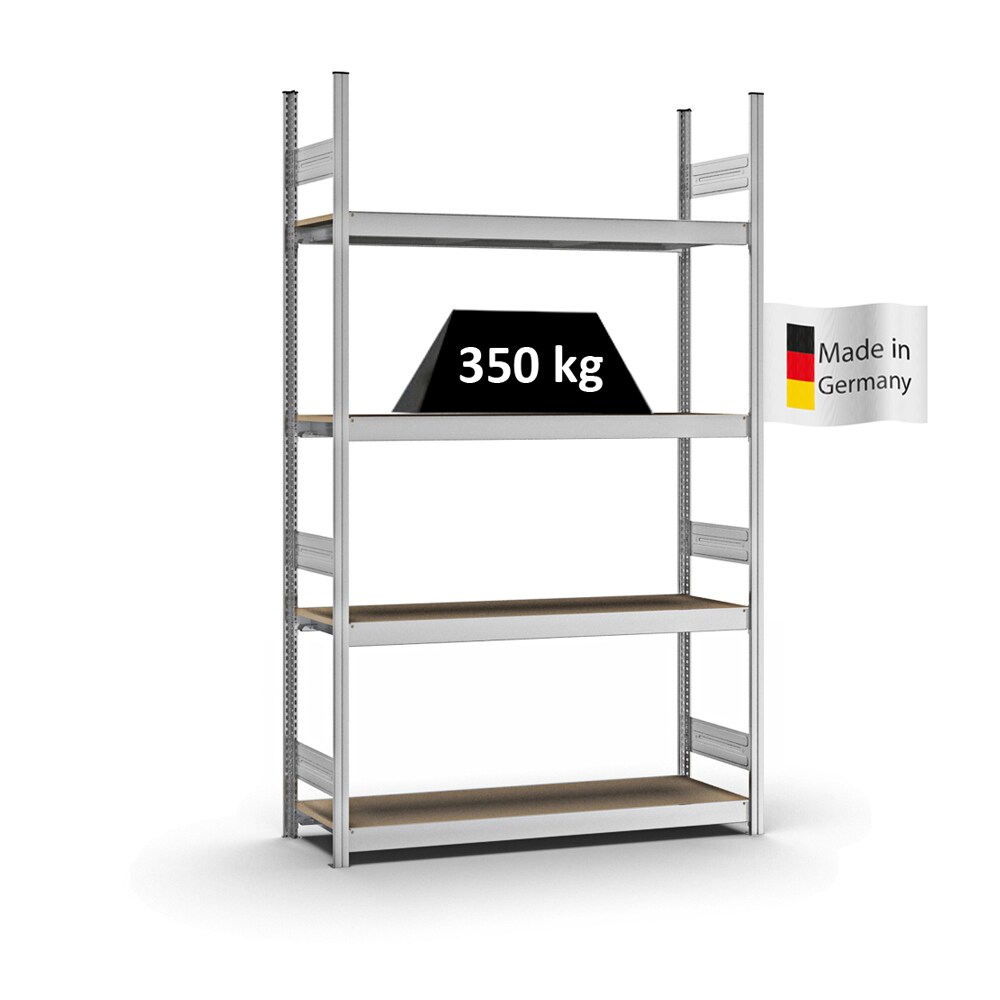 PROREGAL Weitspannregal Stecksystem T-Profil | HxBxT 250x150x40cm | 4 Ebenen | Spanplatten-Fachboden | Fachlast 350kg | Verzinkt | Lagerregal