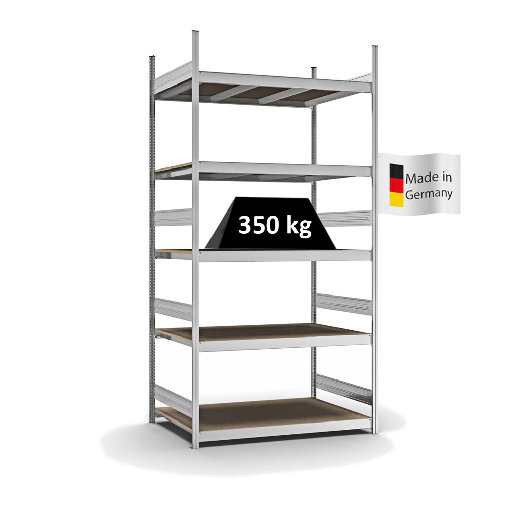 PROREGAL Weitspannregal Stecksystem T-Profil | HxBxT 300x150x80cm | 5 Ebenen | Spanplatten-Fachboden | Fachlast 350kg | Verzinkt | Lagerregal