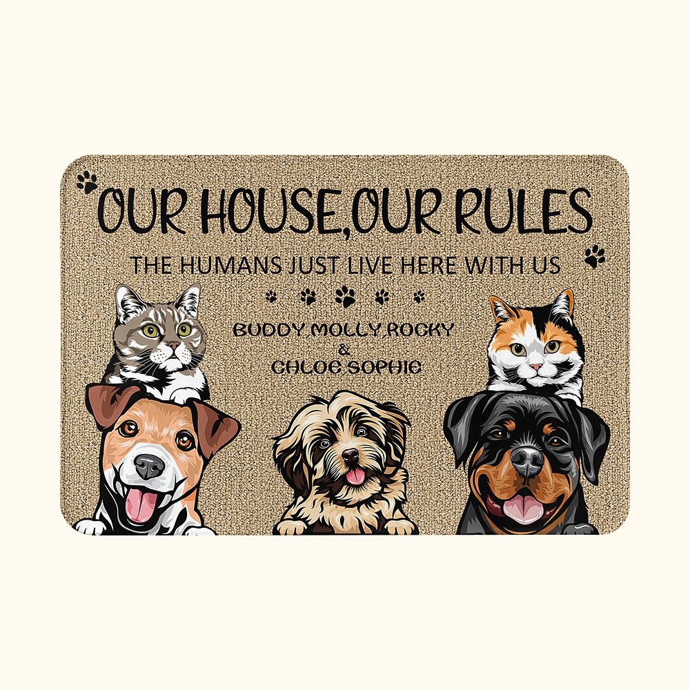 Tapis de porte personnalisé My House My Rules The Humans Just Live Here with Me Door Mat Gift for Dog Lovers Cat Lovers Home Decoration