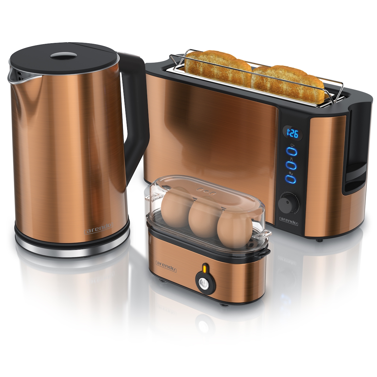 Arendo Frühstücksset, Wasserkocher 1,5l, 2-Scheiben Toaster Langschlitz, 3er Eierkocher, Kupfer