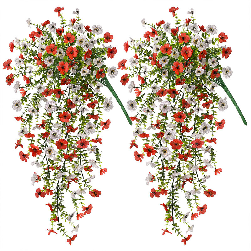 4Pcs 29.5in/75cm Artificial Faux Hanging Flowers Plants for Outdoor Decor Outside Fake Mums Violets with Eucalyptus Realistic Daisy Trailing Vines for Yard Balcony Porch Decor(red&white)