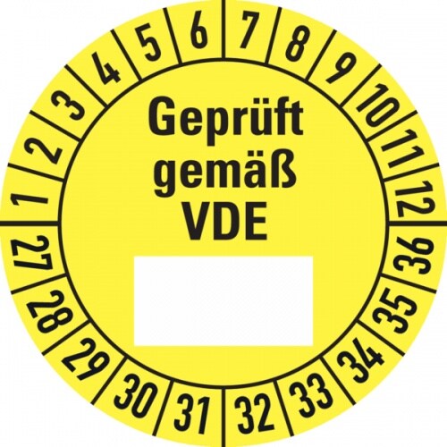 König Werbeanlagen Prüfplakette ab 27, Geprüft gemäß VDE (Freifeld), gelb/schwarz, Folie, Ø 30 mm - Bogen = 10 Plaketten - 30 mm Folie selbstklebend