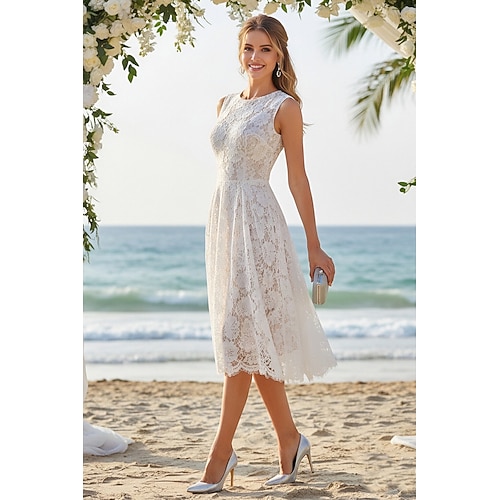 Linea ad A Lunghezza Tè Abito in Pizzo Piccolo vestito bianco Elegante Piccoli Abiti Bianchi Senza Maniche Girocollo Matrimonio con Pizzo Pieghe