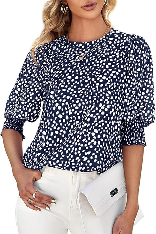 Women's Polka Dot 3/4 Sleeve Blouse Tops Ladies Casual Office Work Crew Neck T-Shirt (darkblue, L)