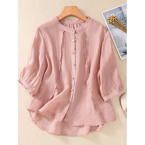 Per donna Camicia Camicie di cotone e lino Blusa Tinta unica Essenziale Casual Manica 3/4 Collo a V Top Regolari Quotidiano Bianco Rosa Verde Estate Primavera