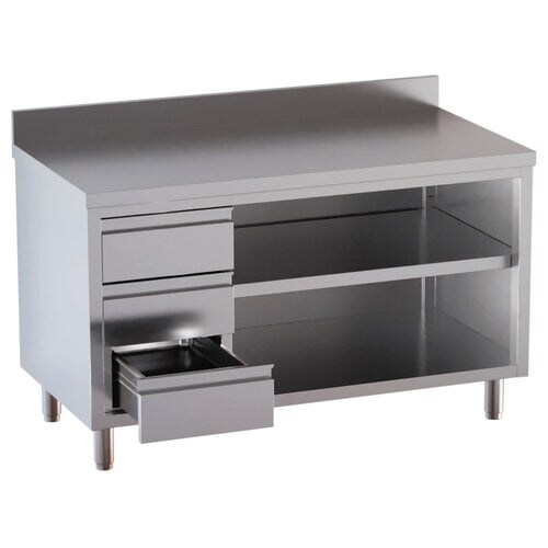 VM Europa Edelstahl Arbeitsschrank, 3 Schubladen links, mit Zwischenboden - alle Größen montiert: 120 x 70 cm / mit Aufkantung / fertig montiert