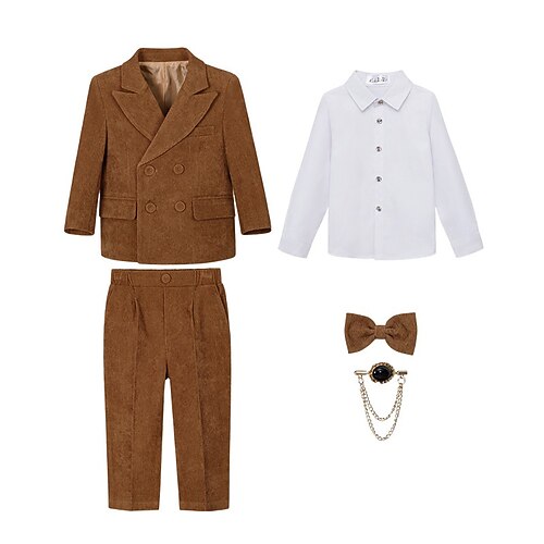 Completo da fedi per bambini, 5 pezzi, blazer pantaloni camicie cravatta ragazzo abito formale casual esterno festa moda fresco basic tinta unita tasca bottoni nero vino viola poliestere