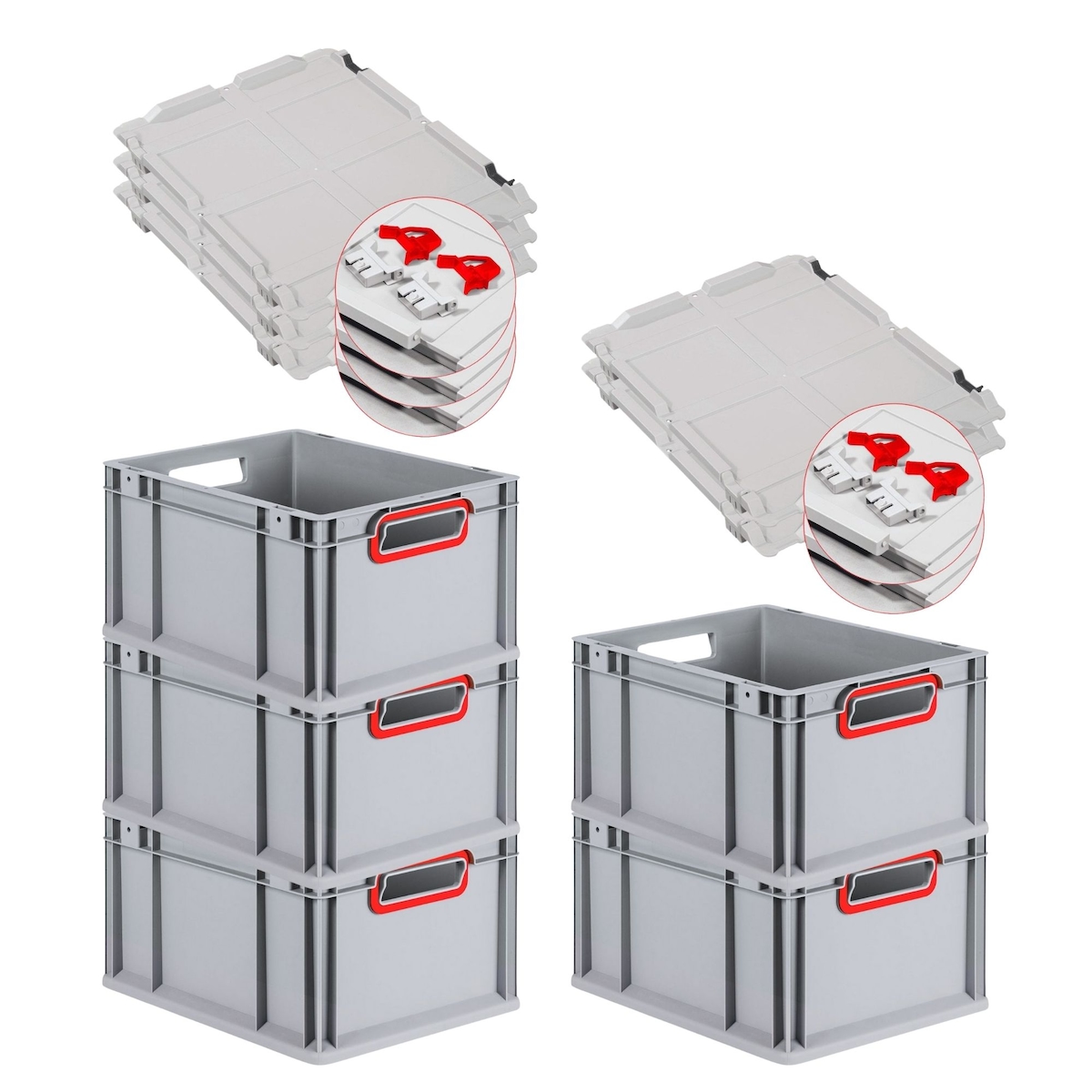 PROREGAL 5x Eurobox NextGen Grip mit Scharnierdeckel & schwarzen Verschlüssen | HxBxT 22x30x40cm | 20 Liter | Griffe offen | Glatter Boden