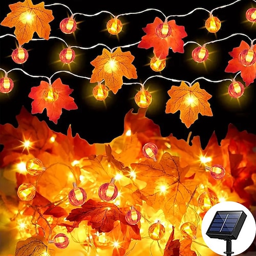 Luci solari a forma di zucca e foglia d'acero, da favola, per Halloween, 6,5 m, 30 LED, impermeabili, per esterni, da giardino, per l'atmosfera della festa di Halloween, per la casa, balcone,