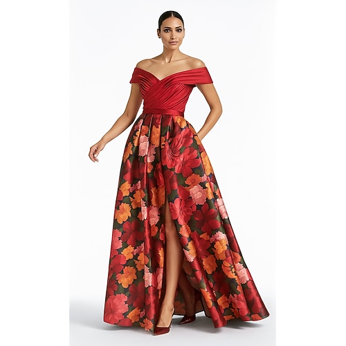Linea ad A Lunghezza al pavimento Abito da Sera Da principessa Abito formale Elegante Manica Corta Senza Spalle Matrimonio Formale Tasca Nylon con Spacco
