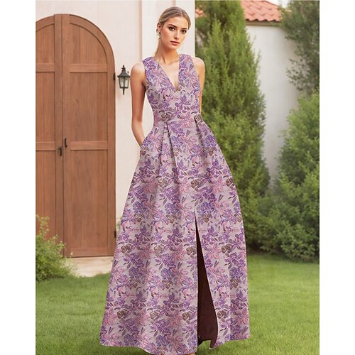 Linea ad A Lunghezza al pavimento Abito da Sera Elegante Vintage Senza Maniche Scollo a V Matrimonio Formale Nylon con Spacco Tasca
