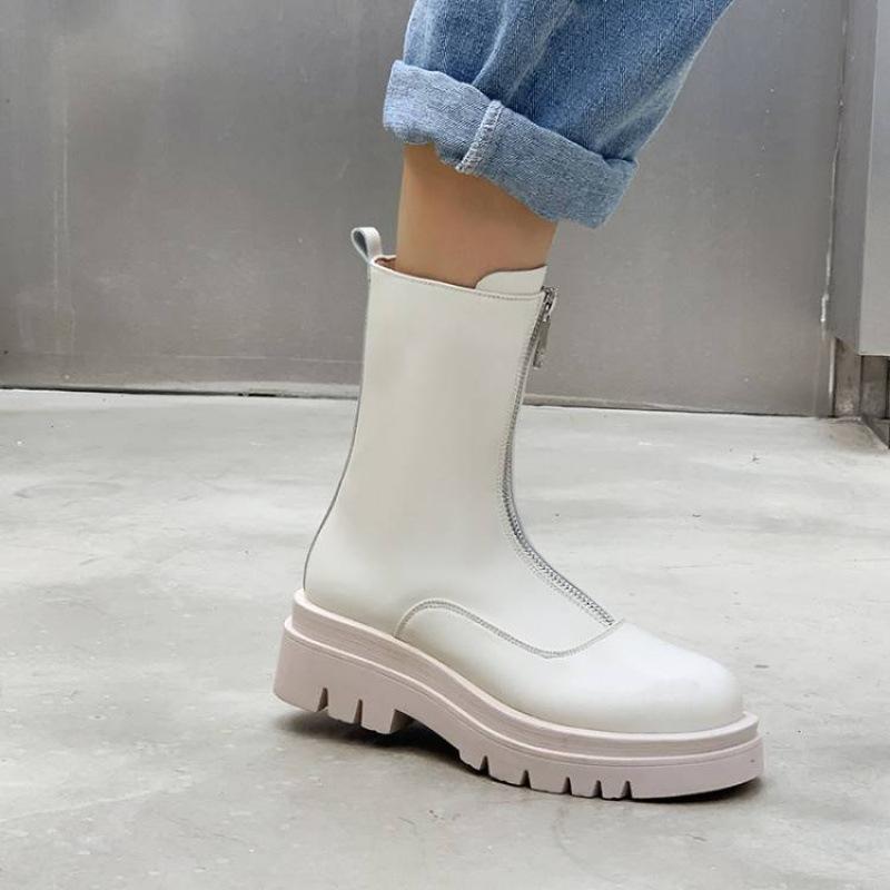 Nieuwe dames ronde neus rits Martin laarzen effen kleur medium hak dikke zool antislip leer dames laarzen herfst en winter medium laarzen cm
