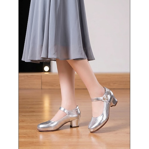 Scarpe da ballo da sala da donna in argento metallizzato, décolleté con tacco basso e cinturino Mary Jane per balli aggraziati
