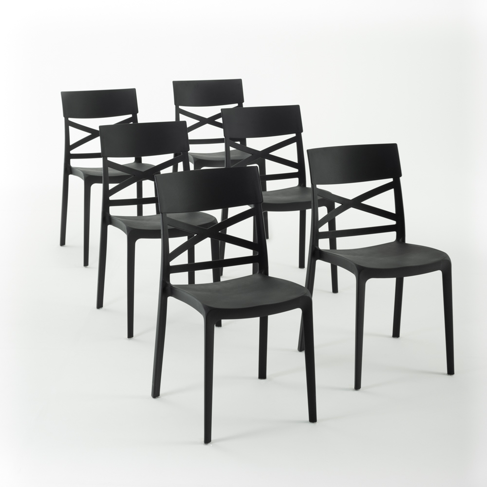 RATTATAN Essgruppe 135x80 cm mit Holzplatte und 6 stapelbaren Polypropylen-Stühlen, elegant und robust – Ulisse+Martina Schwarz/Eiche/Schwarz