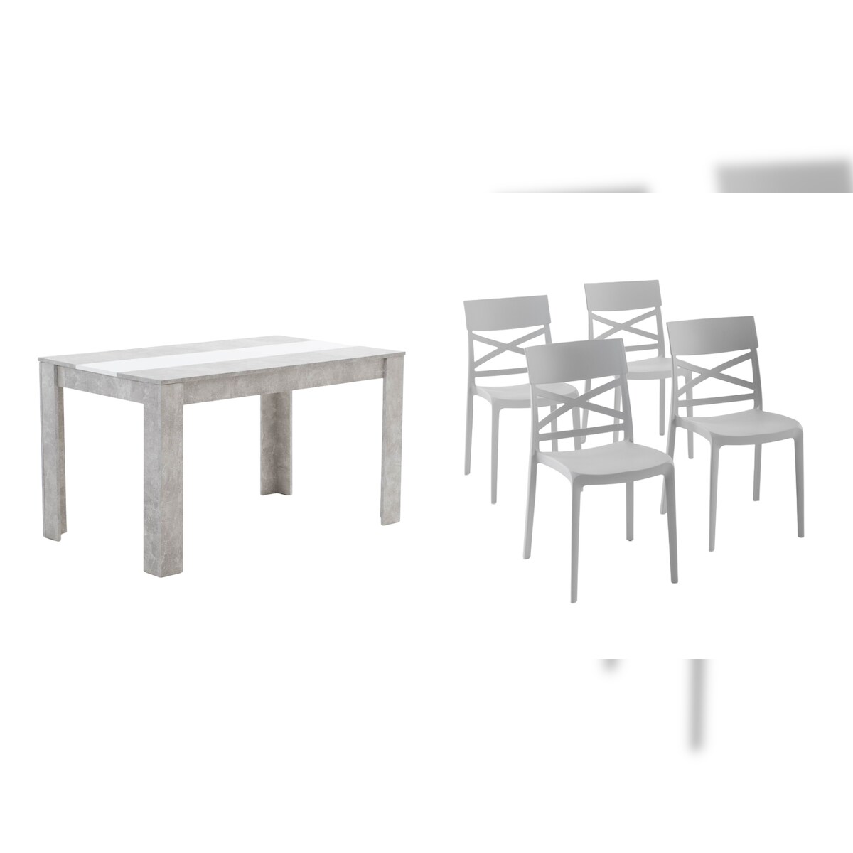 RATTATAN Essgruppe 135x80 cm mit Holzplatte und 6 stapelbaren Stühlen, elegantes Design für Esszimmer – Ulisse+Martina Grau/Grau/Weiß