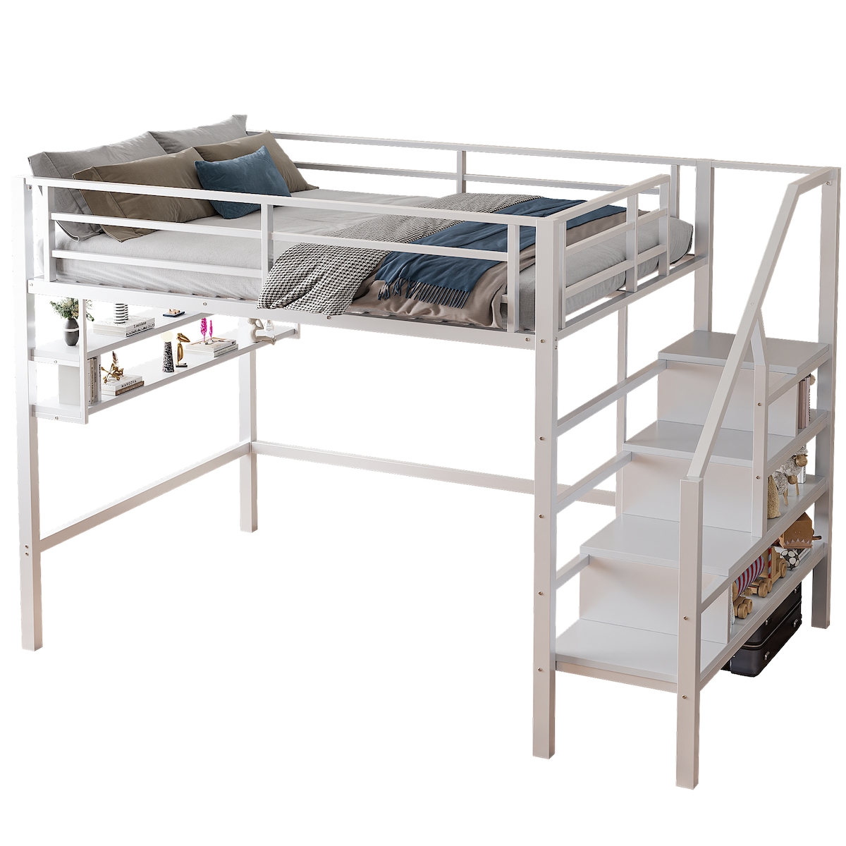 STILVORA Hochbett 140x200 aus Metall mit Stauraumleiter und Regalen, stabiles Loftbett mit MDF, platzsparendes Design mit Ablagen, modern, Weiß