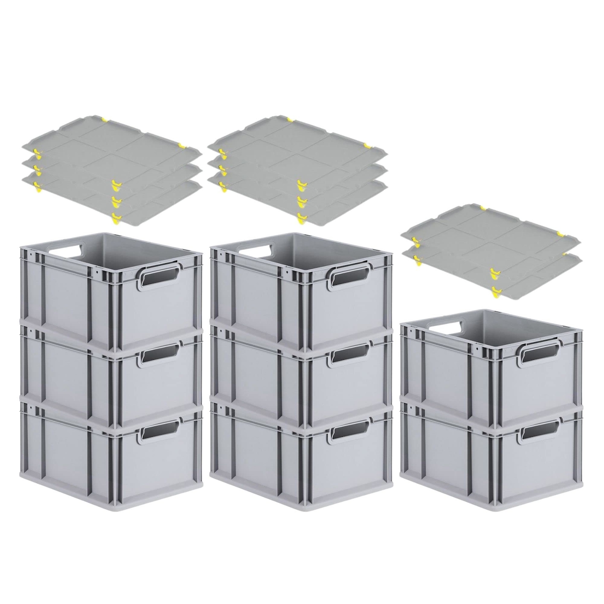 PROREGAL SuperSparSet 8x Eurobox NextGen Economy mit Auflagedeckel & 4x Verschlüsse Gelb, Griffe offen, HxBxT 22x30x40cm, 20L, Eurobehälter, Box